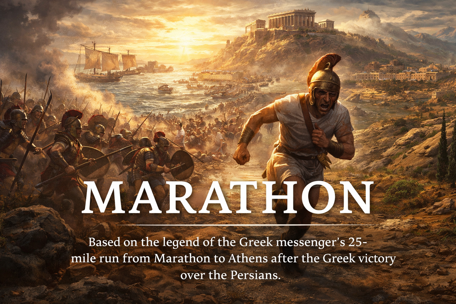 The tradition of marathons was inspired by the legend of an ancient Greek messenger who raced from the site of Marathon to Athens, a distance of nearly 25 miles. He carried with him news of the Greek victory over an invading army of Persians. After making his announcement, the exhausted messenger collapsed and died.