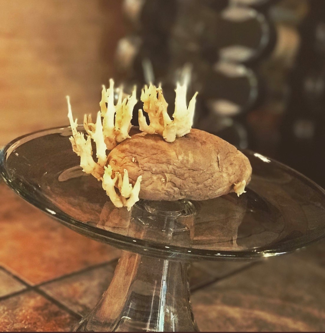 As you look at this potato you can see it has taken a beating; forced to consume itself in the struggle to survive. Its girth has been diminished, its skin is wrinkled, bruised, and the delicious insides depleted. Yet we also see growth. Each little stock is a middle finger F-you to all of life's adversity. If planted this potato has the potential to grow into a productive potato plant. This potato is a survivor.